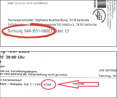 Für verloren gegangene Tickets kann kein Ersatz geleistet werden, somit verfällt der Anspruch auf Zugang zu der Veranstaltung. Bei Tickets die online gekauft wurden reicht die Bestellbestätigung.